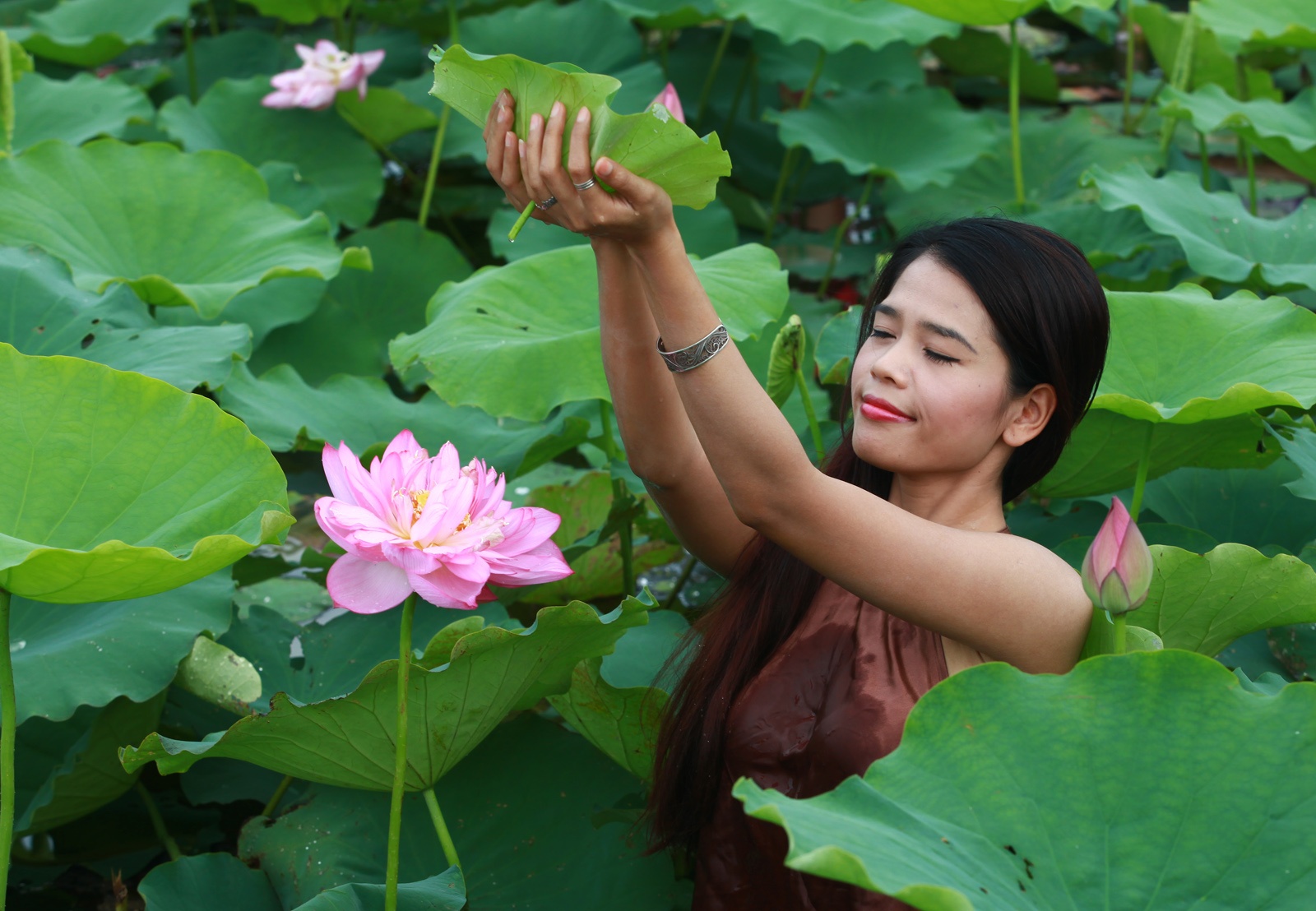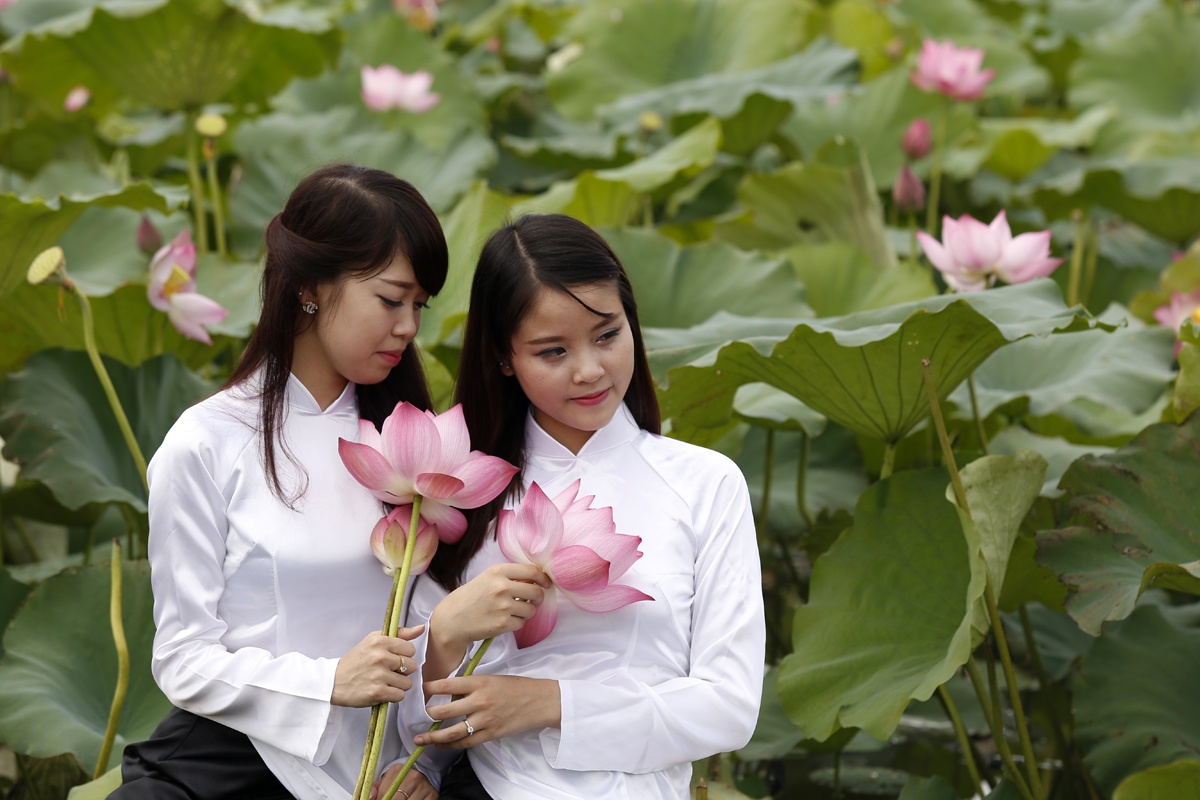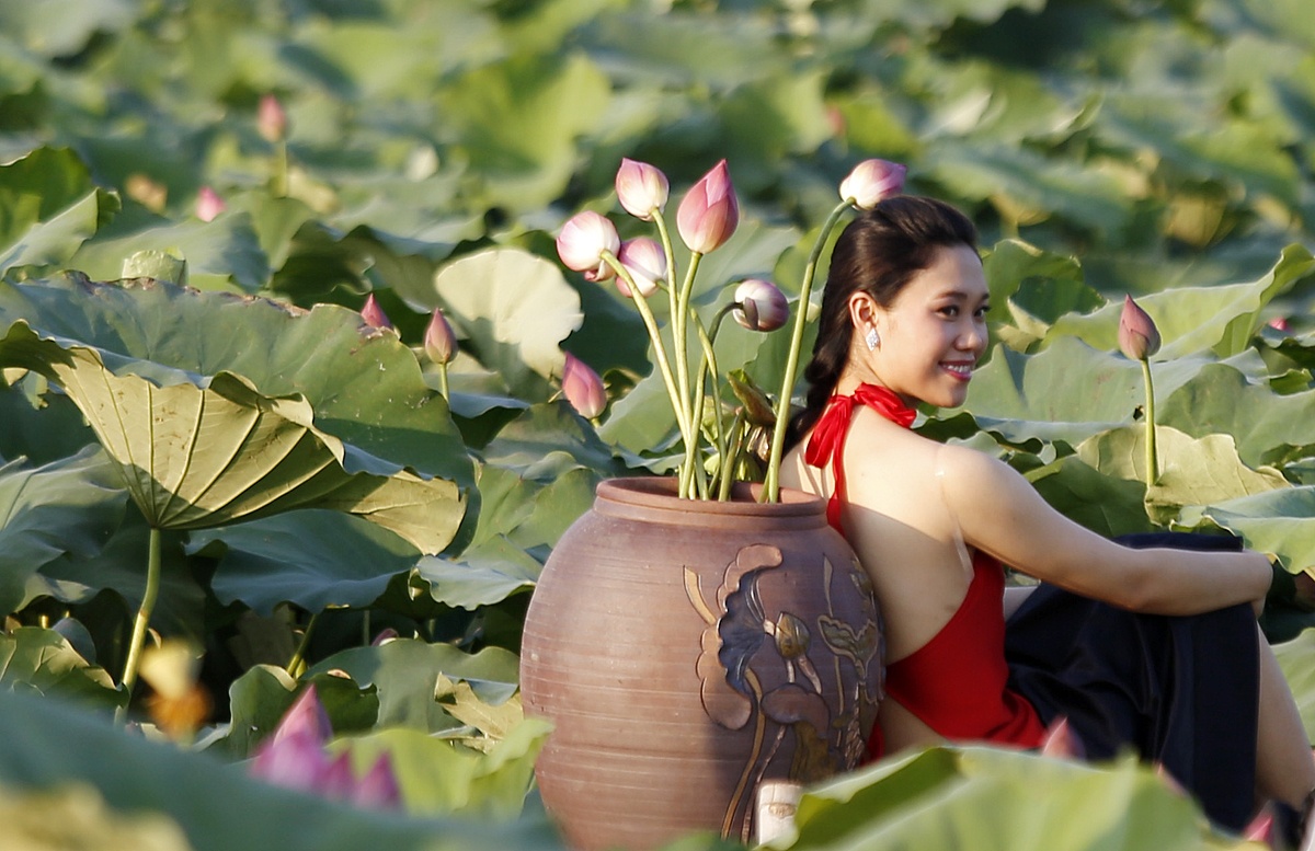 | Đầm sen bên hồ Tây (Hà Nội) đang vào mùa nở hoa, rất đông thiếu nữ tìm đến tạo dáng chụp ảnh. |