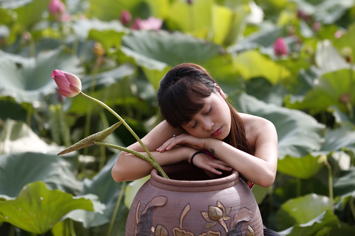 | Các cô gái muốn hoài cổ thì chụp với bình gốm có cắm sen, mặc yếm để vai trần mơ màng trước ống kính. |
