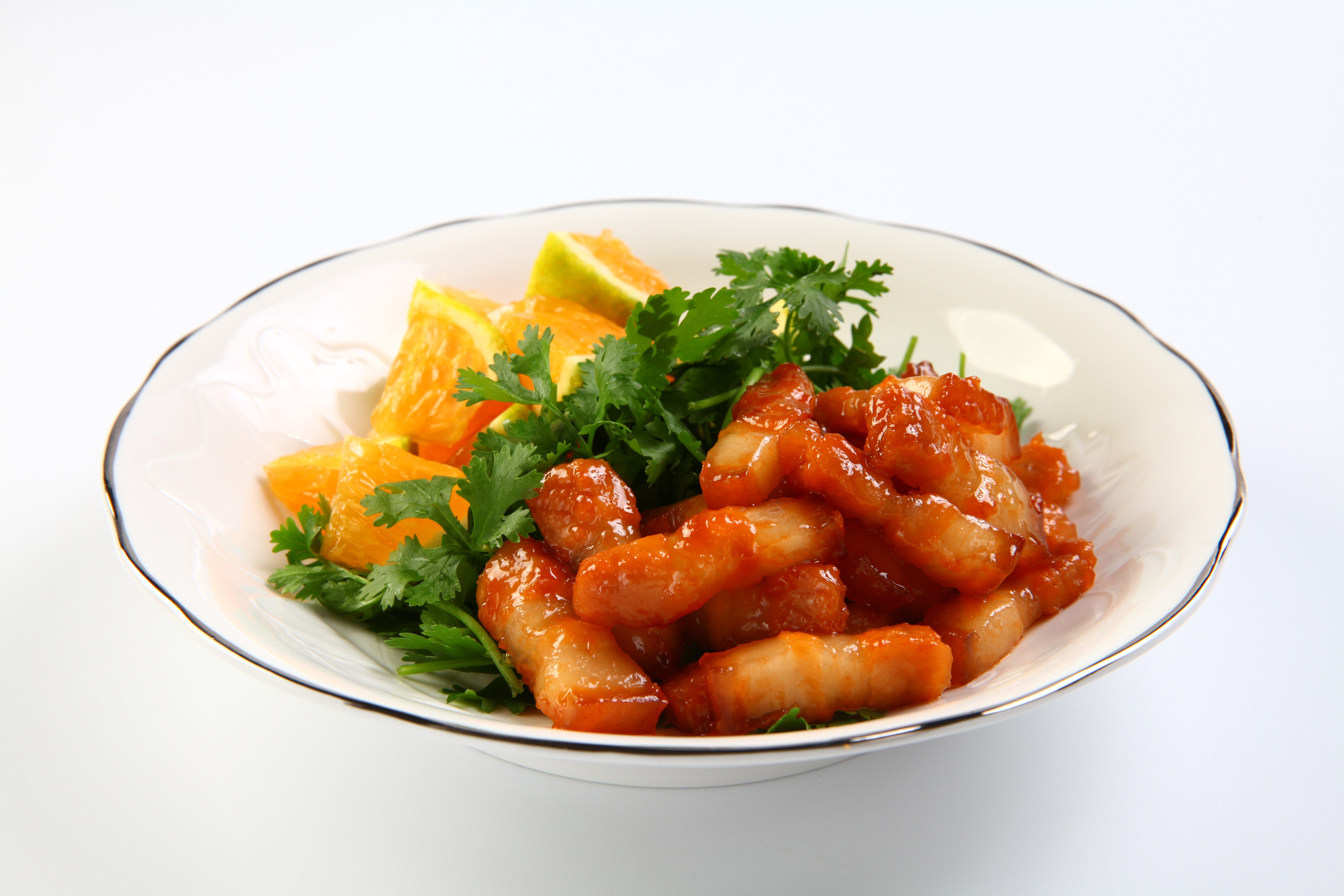 Khi ăn, xếp ngò rí vào đĩa, rồi đổ thịt lên trên. Món này dùng với cơm nóng.