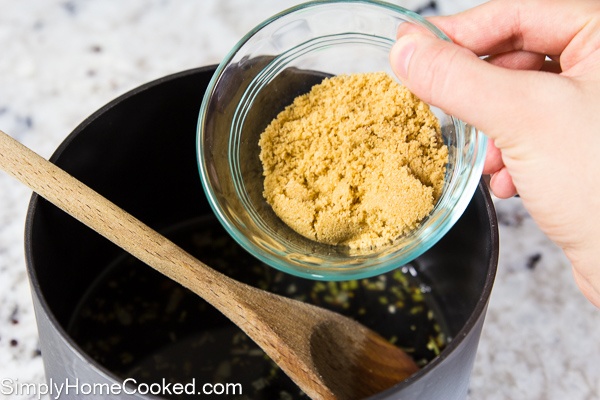 Cho thêm đường nâu, xì dầu (nước tương) và nước. Đun lửa vừa khoảng 5 phút. Ảnh: Simply Home Cooked. |