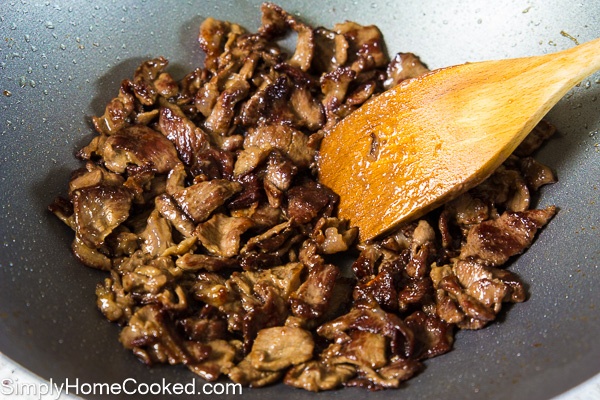 Cho 1/3 bát con dầu ăn vào chảo làm nóng, chia thịt bò xào làm 2 lần. Ảnh: Simply Home Cooked. |