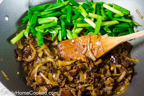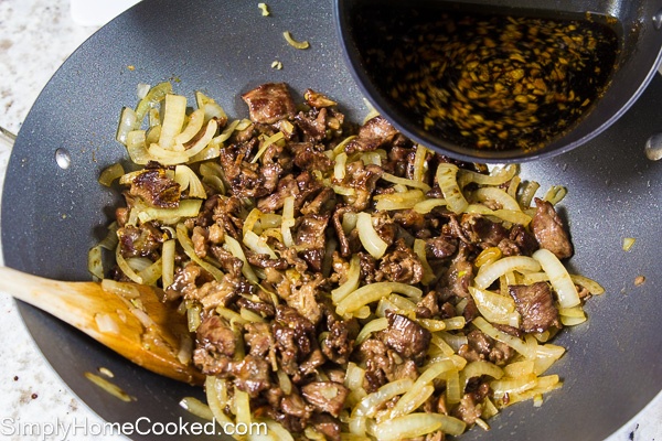 Đổ thịt bò vừa xào vào chảo đang chứa hành tây. Đồng thời đổ cả phần nước sốt làm ban đầu vào cùng, xào tiếp khoảng 5 phút. Ảnh: Simply Home Cooked. |