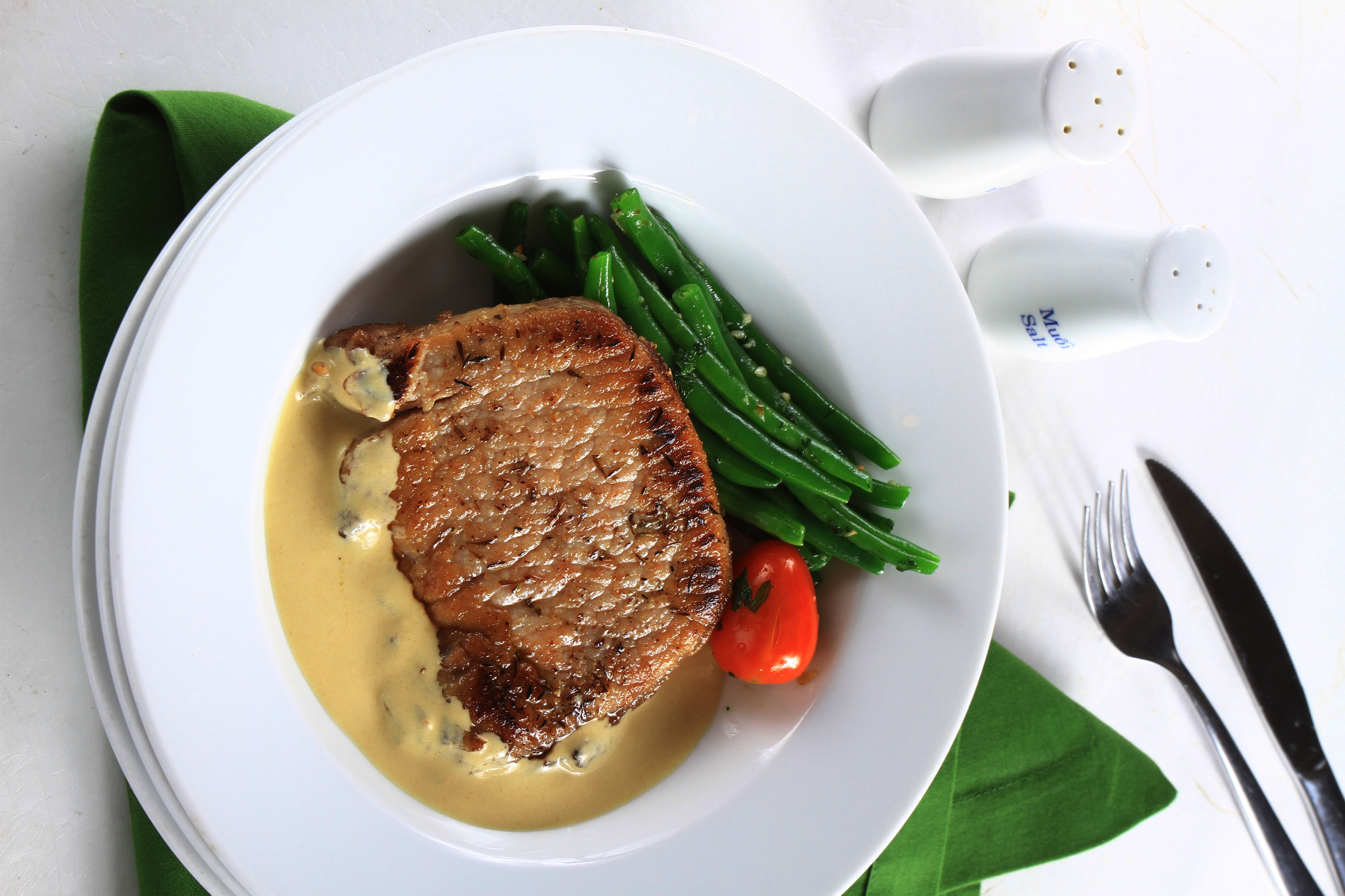 Rửa sạch thịt heo, xắt thành 4 miếng lớn. Ướp thịt heo với ít muối, ít tiêu, tỏi băm. Nướng chín thịt bằng lò nướng.