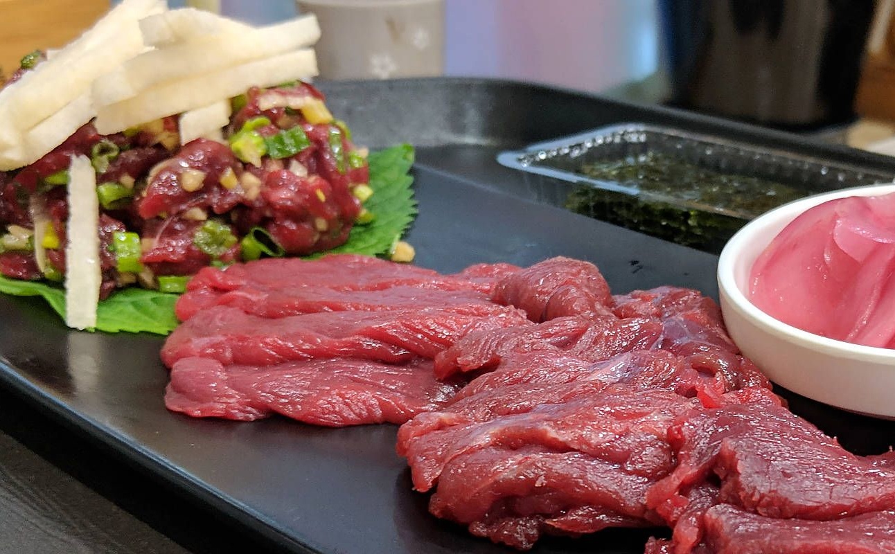 Ở Jeju có truyền thống ăn thịt ngựa, gọi là mal gogi. Những vùng đồng cỏ núi tại đảo từ lâu là điều kiện thích hợp để phát triển các trang trại chăn nuôi. Người ta có thể thưởng thức thịt ngựa với món súp bột xé tay sujebi, nướng bulgogi, lẩu với rau shabu-shabu... Ảnh: KoniKorean. |