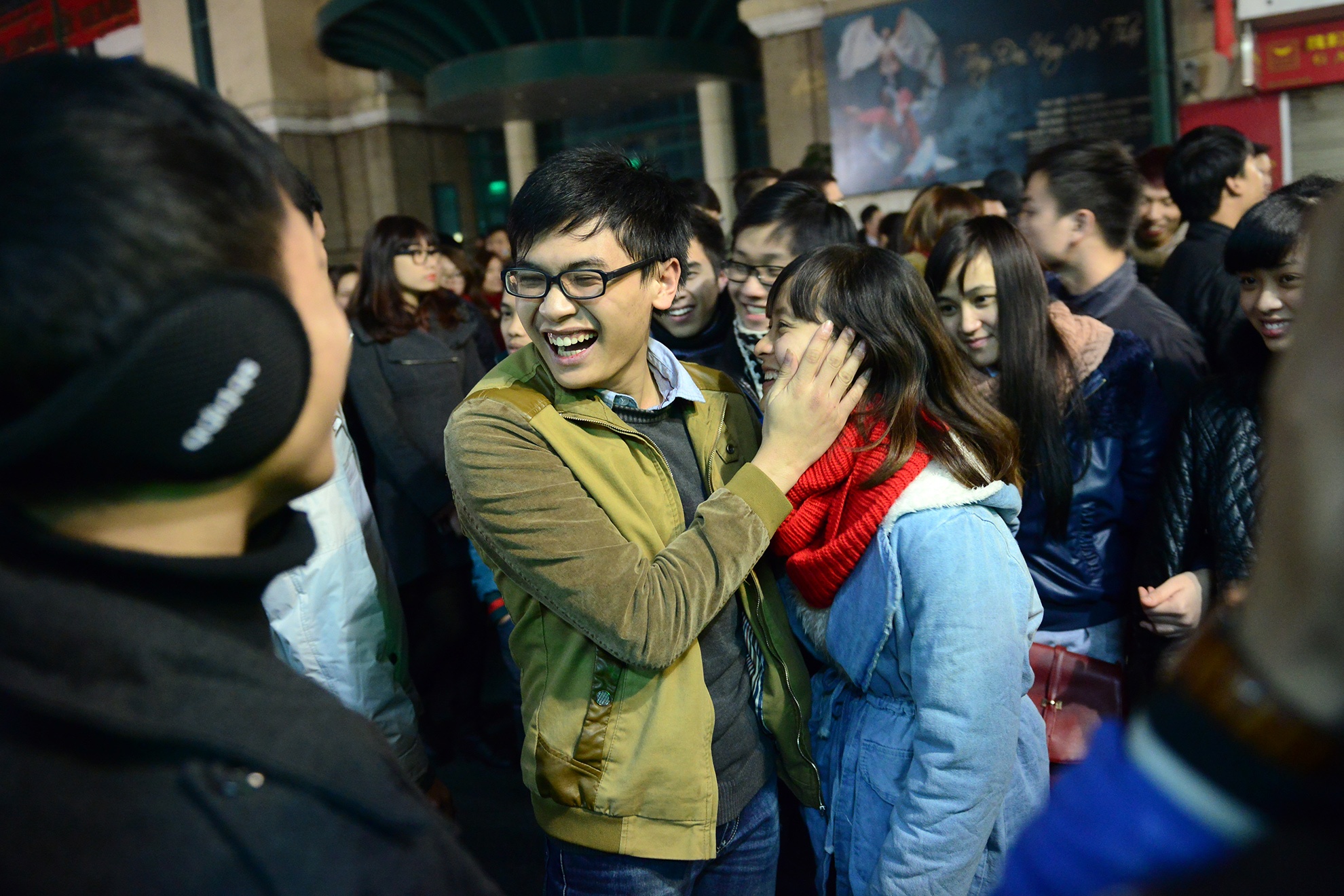 | Nụ hôn nồng nàn xuyên qua hai năm 2013 và 2014 vội vã trao của một cặp bạn trẻ. Ảnh: Lê Hiếu. |