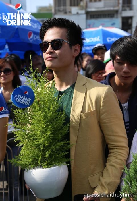 | Ca sĩ Hà Anh Tuấn - đại sứ của chương trình - đến tham dự và nhanh tay đổi nắp chai nhận ngay một chậu cây xanh thân thiện môi trường. |