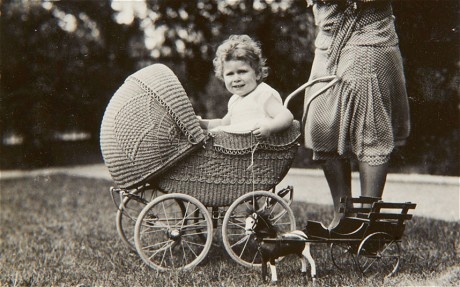 Nữ hoàng ngồi xe đẩy, không quên kéo theo chiếc xe ngựa đồ chơi khi dạo quanh cung điện. Cảnh tượng này diễn ra khi Elizabeth 3 tuổi.