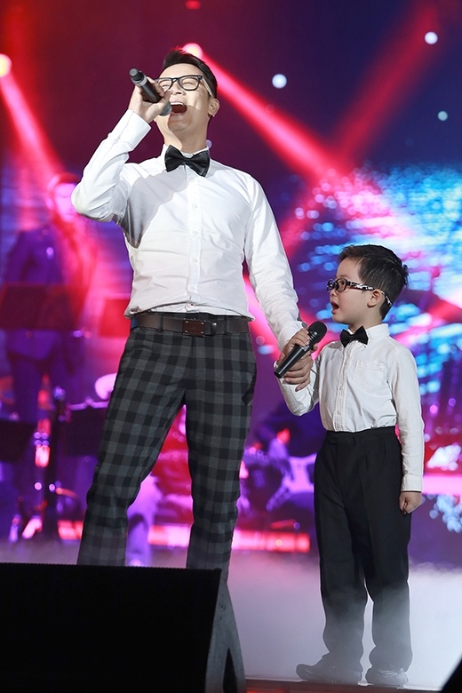 Hoàng Bách - con trai Tê Giác: Không được đánh giá cao về gu thời trang như Trần Bảo Sơn, song Hoàng Bách để lại hình tượng lịch sự, chỉn chu. Trong ảnh, lần đầu tiên, cựu thành viên nhóm nhạc AC&M đưa con trai lên sâu khấu. Hình ảnh cậu nhóc Tê Giác (tên thật là Trần Hoàng Minh, sinh năm 2007) diện trang phục dễ thương, mạnh dạn hát cùng bố để lại nhiều ấn tượng với khán giả.