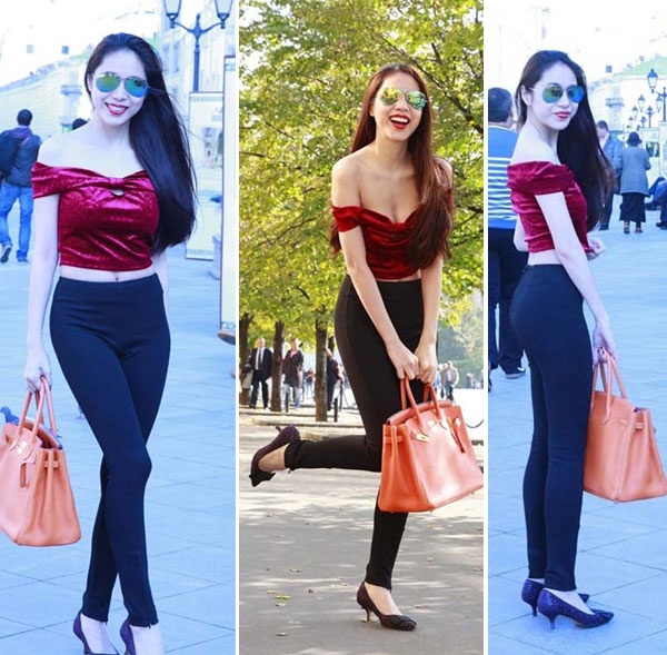 | Khi bạn có vòng eo thon thả, đôi chân thẳng thì không còn lý do gì bạn không khoe lợi thế của mình trong chiếc quần bó, áo crop-top trễ vai như Thủy Tiên. |