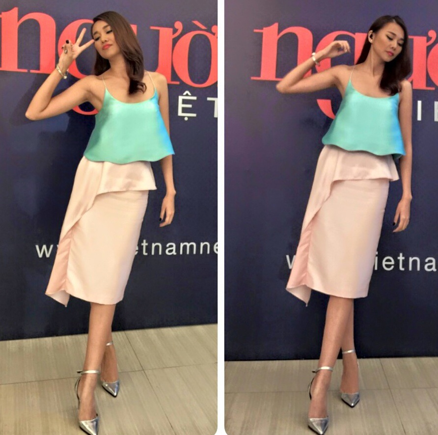Không chỉ mặc đẹp, set trang phục của Thanh Hằng còn phù hợp không gian, thời thiết. Tại điểm casting miền Trung, siêu mẫu chọn bộ cánh tông màu pastel nhã nhặn, dáng áo hai dây và chân váy đơn giản.