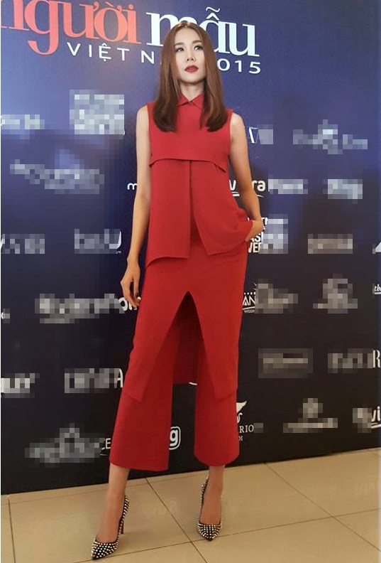 Nữ giám khảo làm mới hình ảnh với set trang phục tông đỏ bắt mắt khi xuất hiện ở điểm casting khu vực miền Tây. Thiết kế có chi tiết xẻ sáng tạo ở thân áo và chân váy. Phụ kiện giày đinh tán cá tính và tóc suông thẳng đơn giản.
