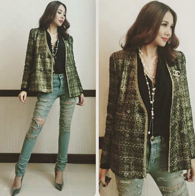Thanh Hằng mang đến phong cách mạnh mẽ và đẳng cấp với các thiết kế của Saint Laurent và Chanel khi chấm thi vòng loại thứ 2 tại Cần Thơ. Chiếc quần jeans xé cá tính từng là món thời trang yêu thích của G-Dragon và Miranda Kerr.