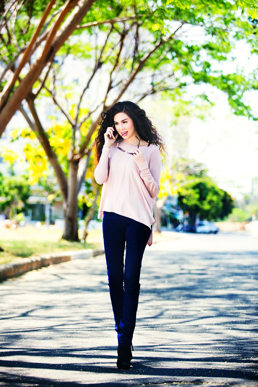 | Quần jeans kết hợp với boots cao, Á hậu Tố Uyên thể hiện phong cách thời trang mạnh mẽ, cá tính. |