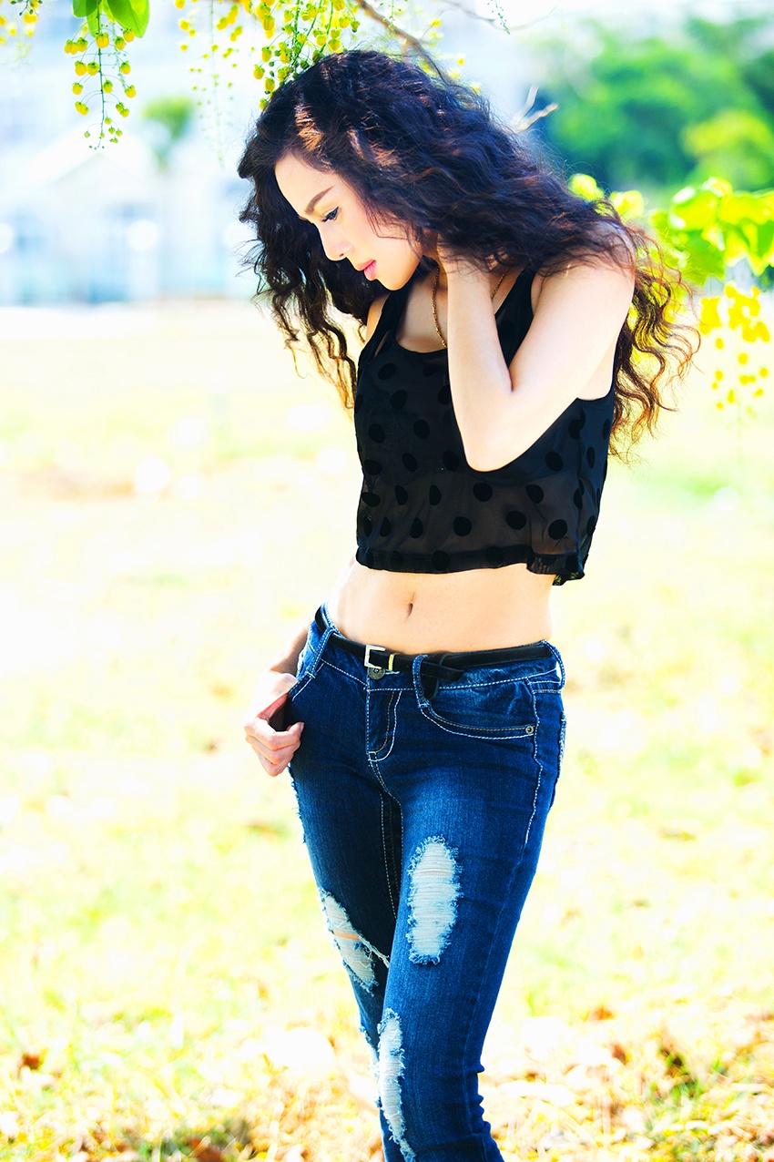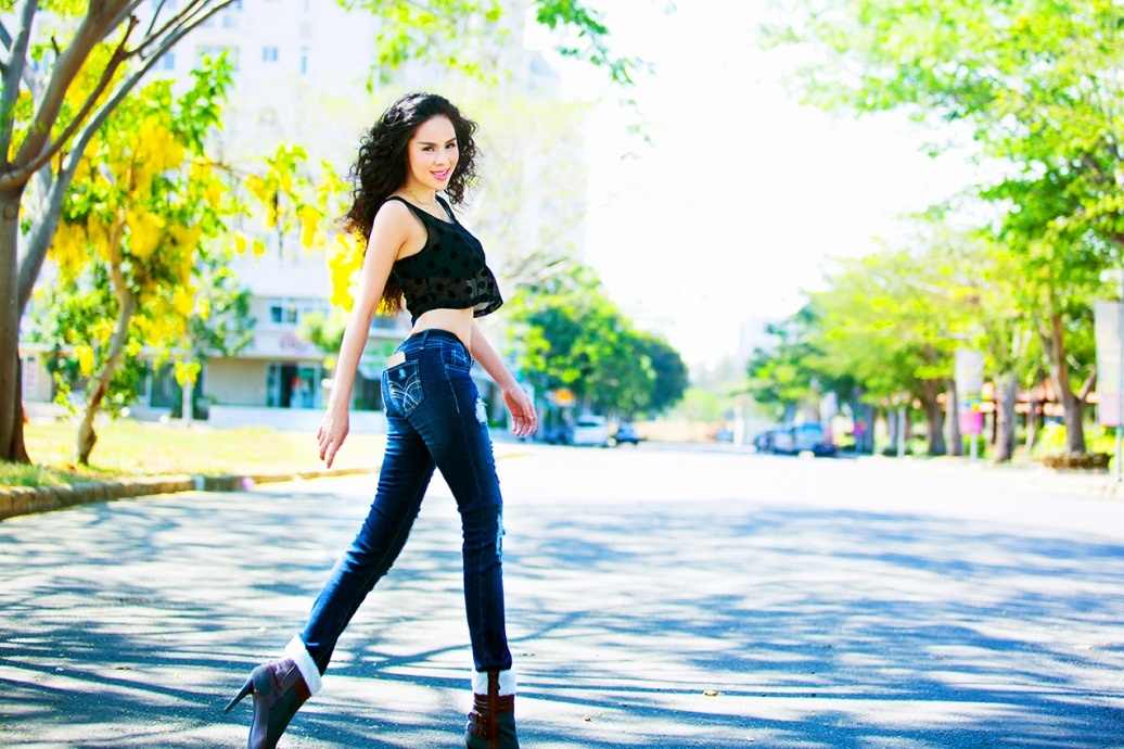 | Quần jeans và áo croptop giúp Á hậu Tố Uyên khoe vóc dáng thon thả, đôi chân dài cùng vòng eo nhỏ. |