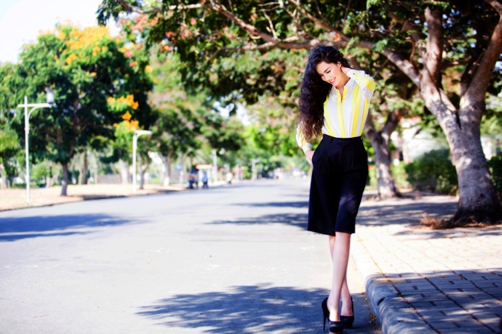 | Cô khéo léo phối áo sơ mi và chân váy cao, tạo vẻ năng động và nữ tính. |