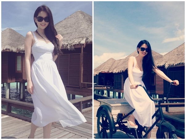 | ‘’Nữ hoàng nội y’’ Ngọc Trinh là một trong những tín đồ thời trang biển. Trong mỗi kỳ nghỉ, người đẹp lại xuất hiện với những hình ảnh mới mẻ, diện những bộ đầm kiểu cách nhưng khá thoáng mát và thuận tiện cho các hoạt động trên biển. Trong ảnh, chân dài tự tin đạp xe bên bờ biển với mẫu đầm trắng chất liệu cotton thông thoáng. |
