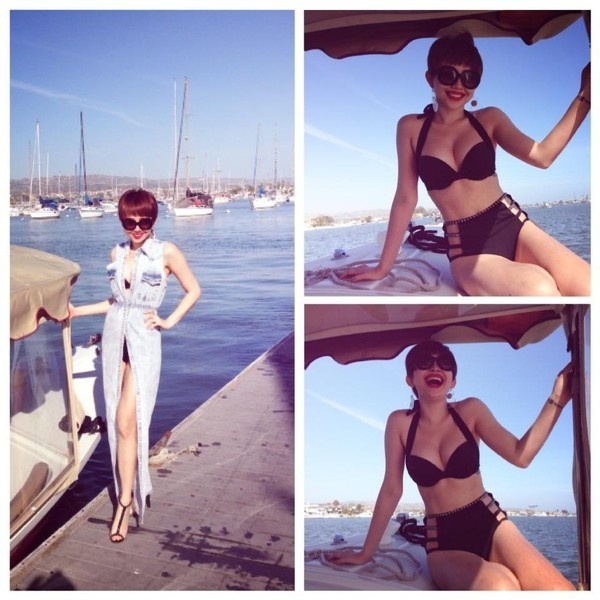 | Ca sĩ Tóc Tiên luôn dẫn đầu các xu hướng thời trang. Ngay cả khi đi biển, người đẹp cũng thể hiện sự sành điệu. Giọng ca Tóc mây từng khiến fan hâm mộ trầm trồ khen ngợi về những bộ cánh dạo biển bắt mắt, hợp thời trang. Trong ảnh là mẫu áo khoác dài chất liệu denim hiện đại, được cô mix sáng tạo cùng bikini cạp cao hợp mốt. |