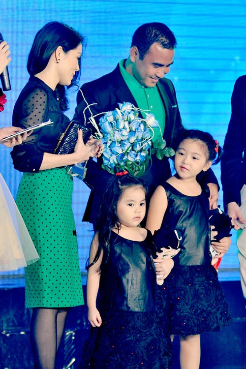 | Cả gia đình nam MC nổi bật với tông màu vàng hợp mốt. Bố Quyền Linh có phần nhạt nhòa vì áo thun đơn giản có tông màu vàng nhạt, nhường sự chú ý cho hai cô công chúa đáng yêu và nghịch ngợm. |