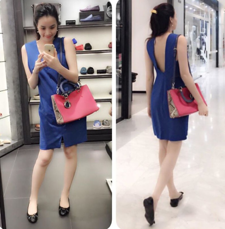 | Mẫu đầm suông với biến tấu khoét lưng được người đẹp tận dụng để khoe nước da trắng. |