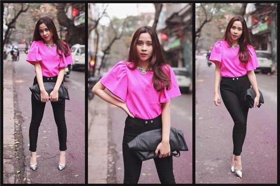 Khi cần thanh lịch, cô lựa chọn áo hồng rực rỡ mix kèm tregging và một chiếc túi xách lớn. |