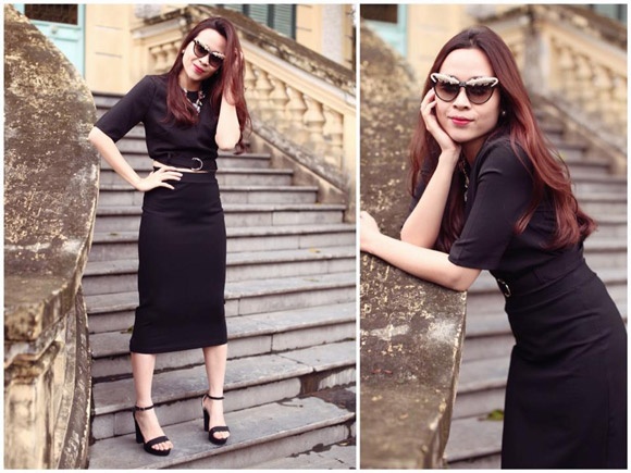 Với tông đen, Lưu Hương Giang làm mất đi khái niệm già nua nhờ kiểu dáng crop top và đôi kính mắt mèo. |
