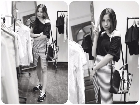 Bà mẹ trẻ có cách kết hợp rất đáng yêu với váy bút chì và giày thể thao. |