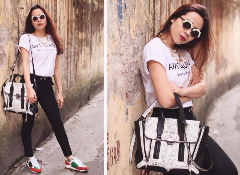 Với phong cách đường phố, Lưu Hương Giang ưu tiên giày thể thao mix kèm áo thun trắng đơn giản. |