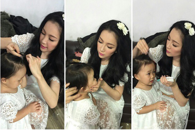 | Một dịp khác, cặp mẹ con diện đầm ren nữ tính. Linh Nga chăm chút tạo kiểu tóc cho con gái hơn 3 tuổi. |