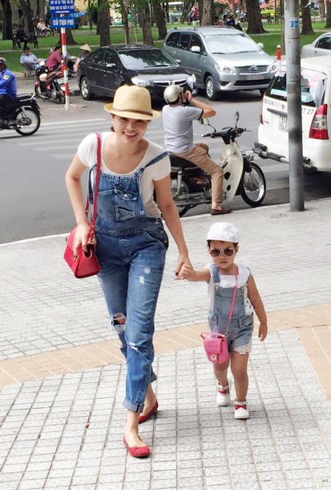 | Vũ Thu Phương và con gái cưng cũng diện trang phục đồng điệu khi du lịch dịp lễ 30/4 - 1/5. Trên đường phố, cặp mẹ con thu hút với trang phục yếm denim hiện đại, đáng yêu. |