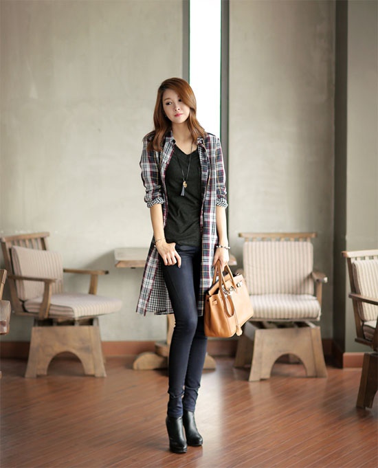 | Áo kẻ dáng dài sẽ dành cho cô nàng cao ráo, thanh mảnh. Bạn sẽ toát lên nét đẹp lãng mạn và phóng khoáng với set đồ áo dây đen bên trong, quần skinny, bốt ngắn cổ và áo sọc dáng dài, thụng. |