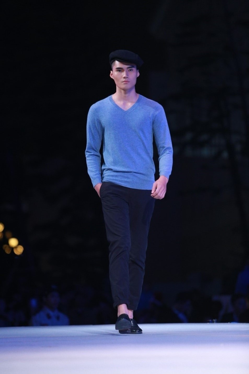 | Chất liệu cashmere dệt từ lớp lông nõn của loài dê quý sống trên những triền núi giá lạnh và cao trên 4.000 m, có trọng lượng siêu nhẹ, mượt hơn lụa và cách nhiệt tốt gấp 8 lần so với len thường, đem lại cảm giác ấm hơn vào mùa đông và mát hơn trong mùa hè. Trong ảnh là người mẫu Quang Hùng, quán quân Vietnam's Next Top Model năm 2014 diện áo cashmere xanh cổ tim và quần âu, toát lên vẻ lịch lãm, cổ điển. |