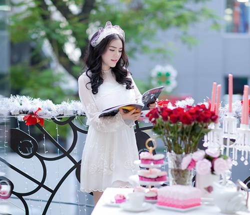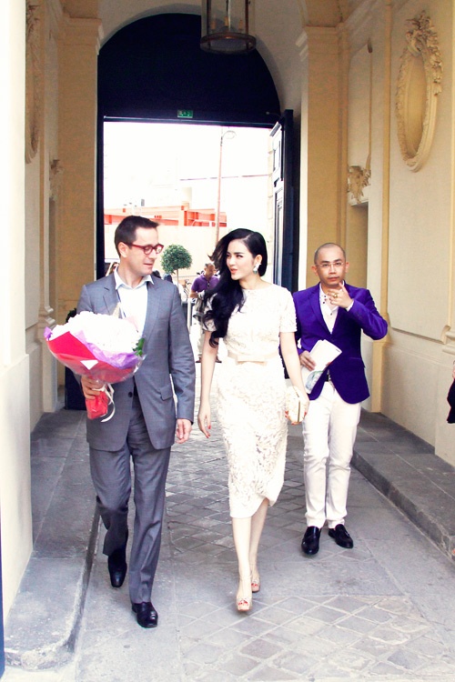 | Hình ảnh cô duyên dáng như một công chúa với chiếc áo dài ren trắng cách điệu khi tham gia sự kiện ở nước ngoài. |