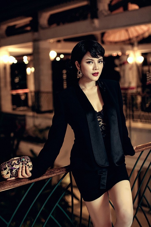 | Có lúc cô lại huyền bí với một chiếc áo ren đen mix kèm blazer tối màu. |