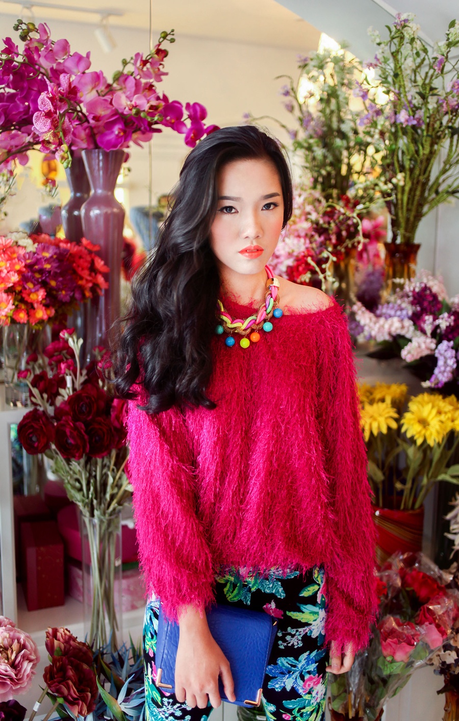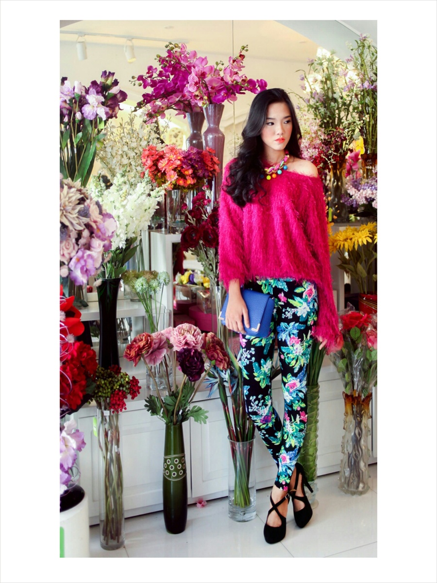 | Áo lông phối cùng quần họa tiết hoa nổi bật, phụ kiện làm điểm nhấn cá tính. |