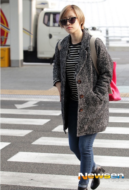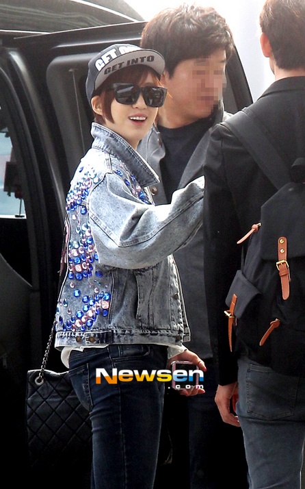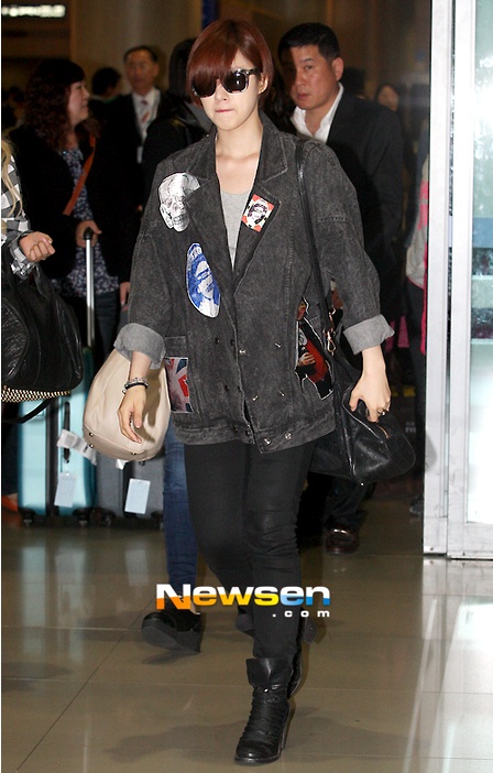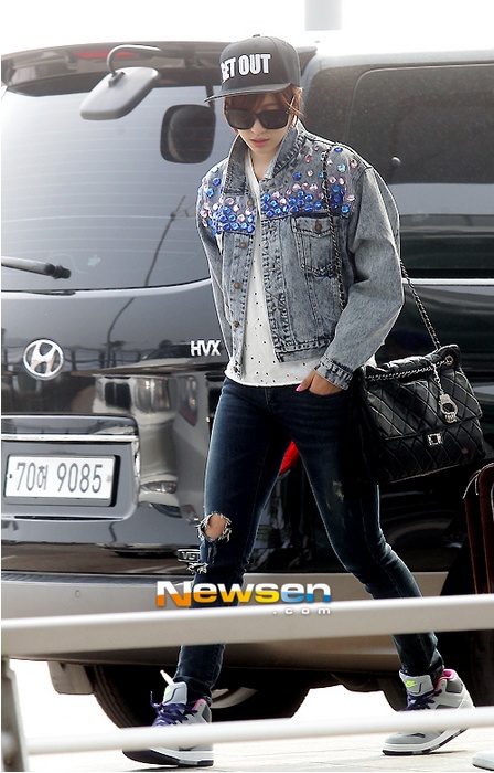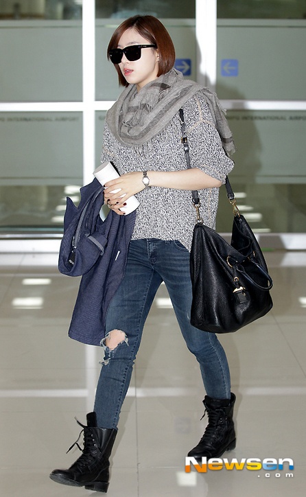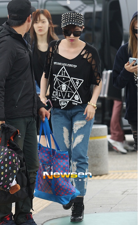 | Eun Jung nổi bật với chiếc váy jean bụi phủi và chiếc ba lô hồng bắt mắt. |
