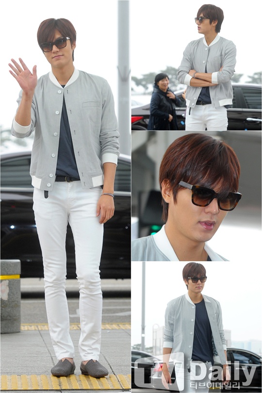 | Một Lee Min Ho có phần "dịu dàng" với quần trắng, áo khoác xám kết hợp với giày xám. |