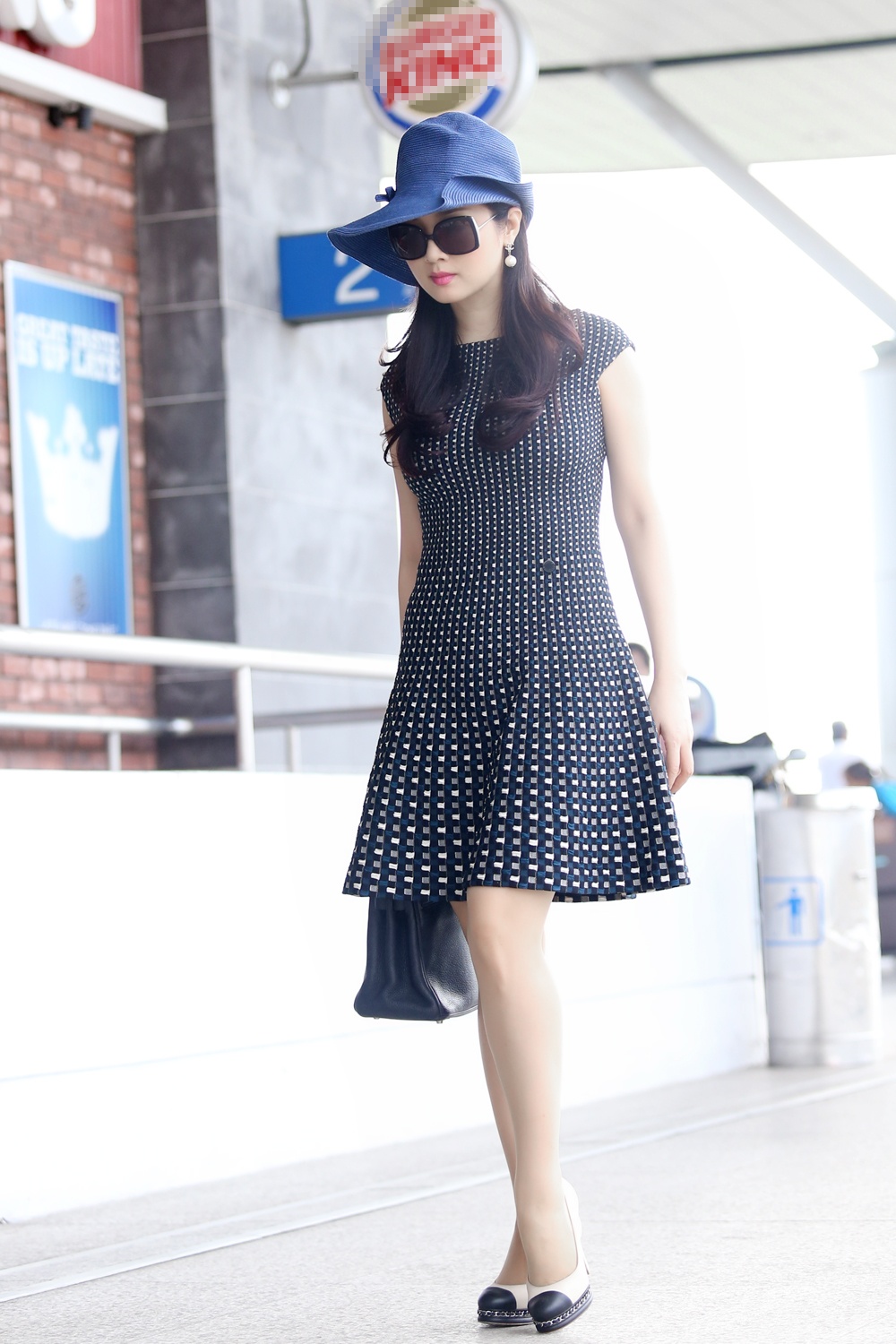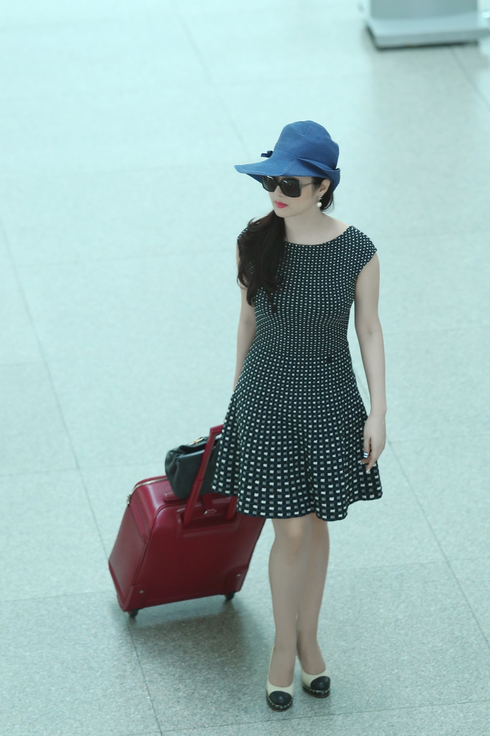 "Người đẹp không tuổi" diện bộ đầm nữ tính, họa tiết chấm bi xuất hiện thu hút một góc sân bay Tân Sơn Nhất.