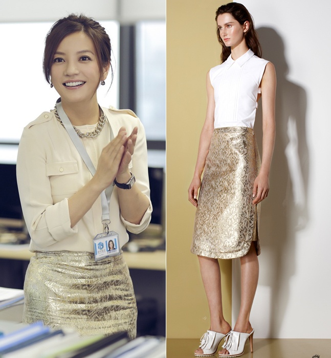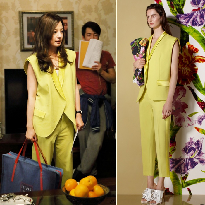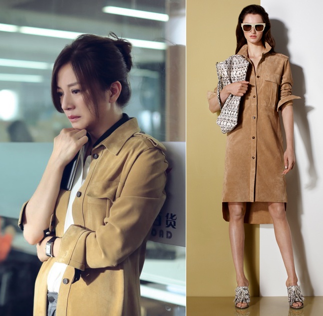 | Vào vai một người phụ nữ của công việc nên trang phục của Triệu Vy chủ yếu là đồ công sở. Trong ảnh, Triệu Vy đã biến chiếc váy cá tính của Ports 1961 thành áo khoác khi kết hợp với áo sơ mi và quần âu. |