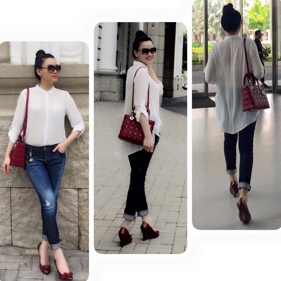 | Trang Nhung có lẽ đã mất một thời gian dài hơn để về dáng được như Thu Thủy. Tuy có tăng vài cân nhưng cô vẫn rất trẻ trung trong trang phục sơ mi, quần jeans đơn giản. |
