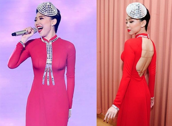 | Chiếc áo dài đỏ ngỡ rất kín đáo nhưng phía sau lưng lại có khoảng hở khá táo bạo. |