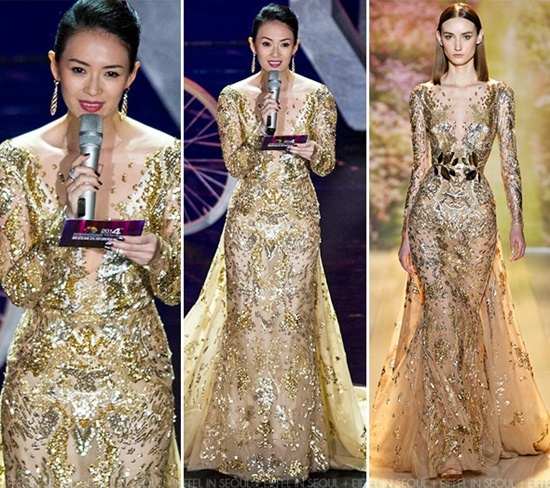| Chiếc váy vàng đính kim sa của Zuhair Murad đã giúp tôn lên vóc dáng tuyệt đẹp của Chương Tử Di. |