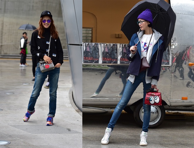 | Các kiểu túi xách bản to in họa tiết, in chữ, clutch rực rỡ cũng tràn ngập đường phố Seoul. |