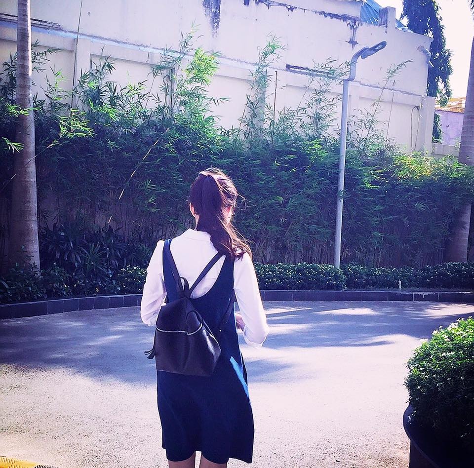 | Thời trang đi học của Hoa hậu xinh xắn với váy gillet, sơ mi trắng và ba lô đeo vai. |