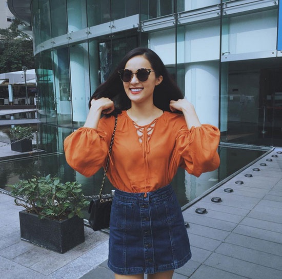 Hạ Vi kết hợp áo voan cách điệu chất liệu mềm mại với chân váy denim