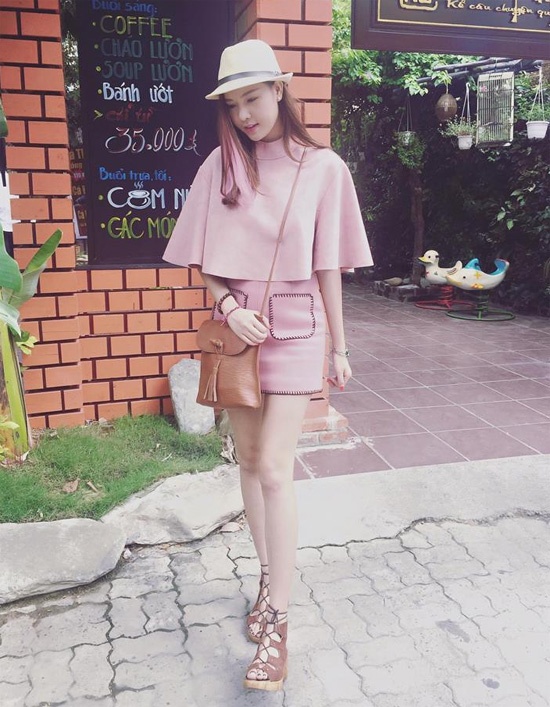 Kỳ Hân như tiểu thư với tông hồng ngọt ngào. Thiết kế kiểu áo choàng tôn thêm nét dễ thương của cô nàng. Túi xách, sandal buộc giây cũng được người đẹp chọn cùng tông với nhau