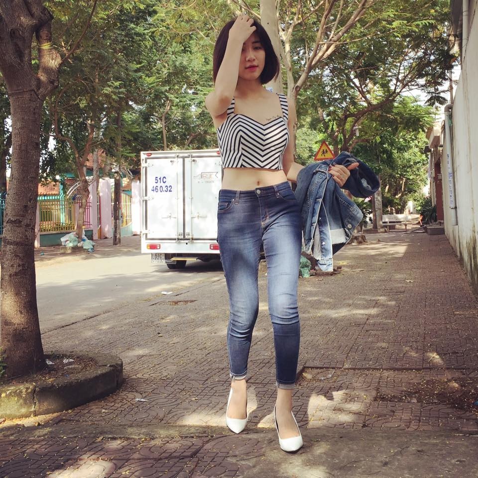 Tới biển Bình Thuận cô nàng chọn áo hai dây và quần short jean trẻ trung.
