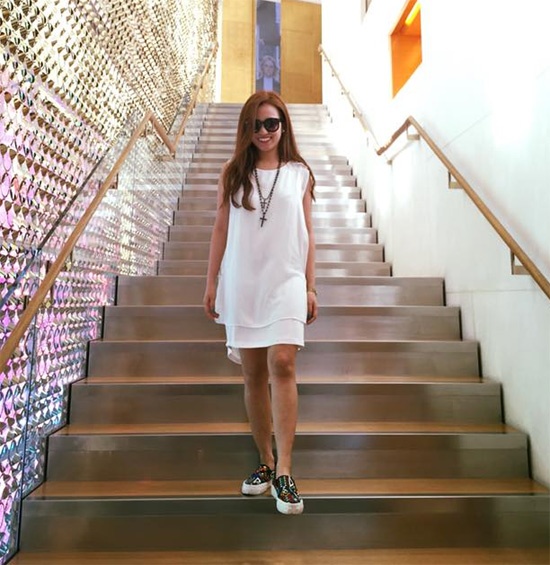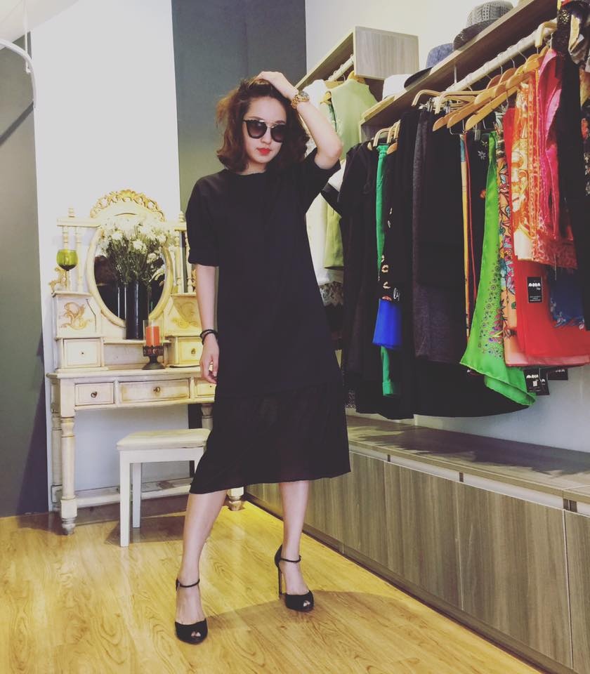 Nếu sở hữu chiều cao tương đối bạn cũng hoàn toàn có thể diện váy dáng dài qua đầu gối như Mi Vân. Để thêm tôn dáng bạn nên kết hợp cùng sandal cao gót.