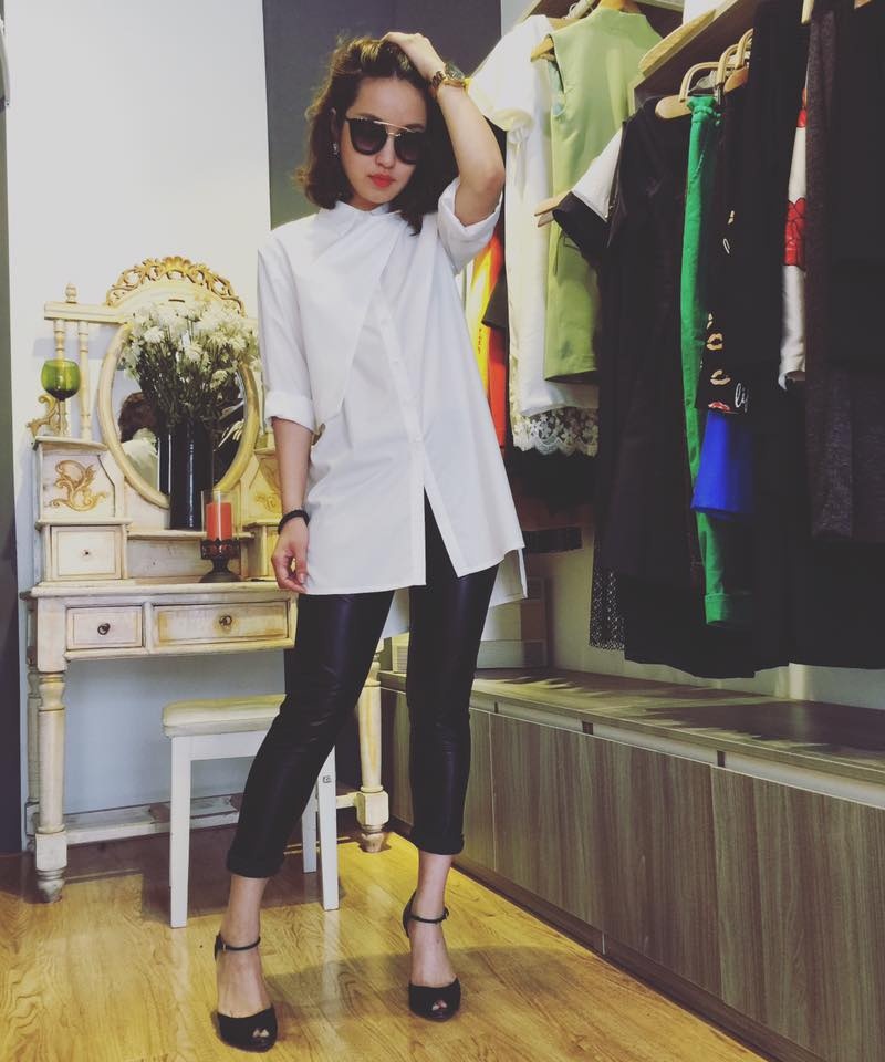 Áo sơ mi trắng Mi Vân lựa chọn thêm trẻ trung với thiết kế hai vạt lệch nhau.