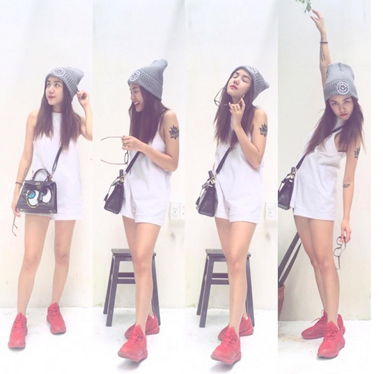 Phương Ly diện đồ trẻ trung khoe chân dài miên man. Để tông màu trắng không nhàm chán cô chọn giày đỏ nổi bật đi cùng.