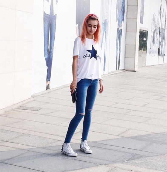 Sở hữu vóc dáng cao ráo, thanh mảnh, áo phông họa tiết hình sao, áo crop top, quần jean rách gối hay giày sneaker mang đến cho MLee diện mạo cực năng động.